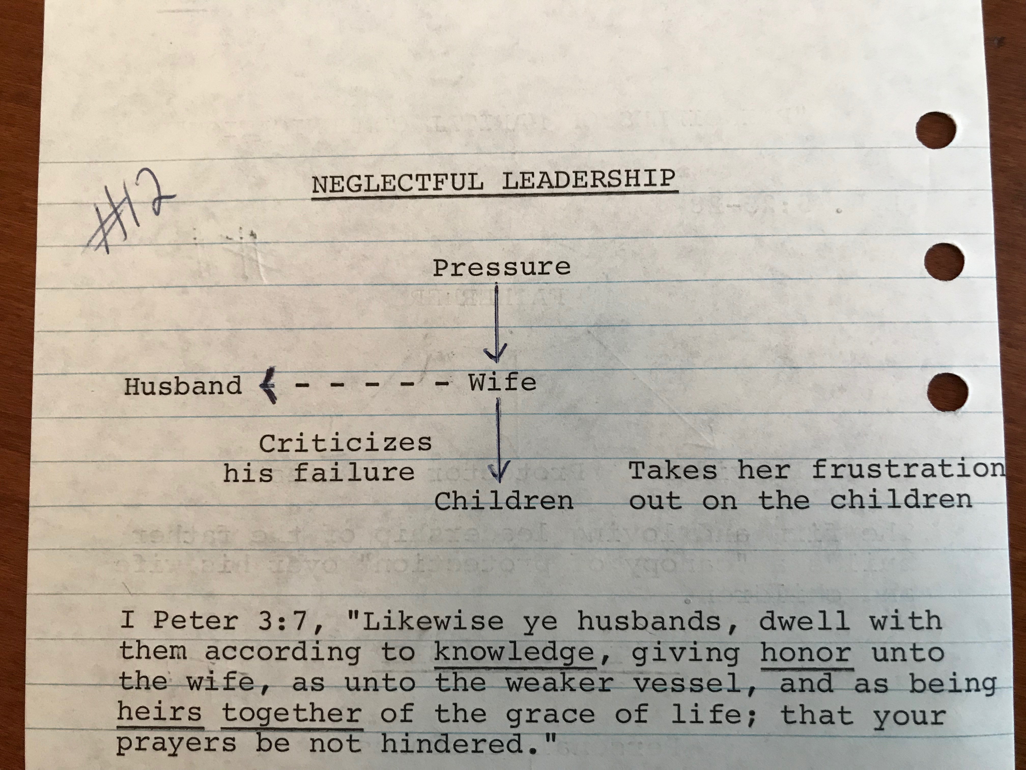 Neglectful Leadership —> Father does not handle personal pressures – practical and spiritual – and does not protect his wife and children … pressures fall on wife/mother .. she may criticize his failure and take her frustration out on their children