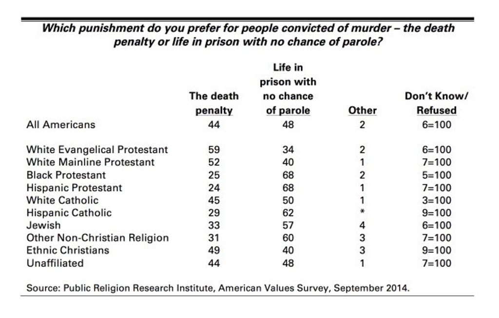 The 2014 Public Religion Research Institute Poll showed that White Christians approved of the death penalty at a higher number than Black or Hispanic Christians.